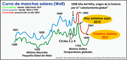Pero la frutilla de la torta de la tontería periodística es negar la influencia del Sol sobre el clima. Y lo hacen diciendo que la variación en la entrega de energía en watts por metro cuadrado no ha variado de manera significativa en los últimos cientos de años. En realidad, la energía no es el único factor del sol que afecta al clima: la actividad magnética del sol varía muy ampliamente, atada al número de manchas de sol en su superficie. La energía es el factor menos importante ya que es prácticamente constante: por eso es precisamente llamada la constante solar!