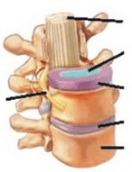 fundamentales: el núcleo pulposo con el anillo y dos láminas cartilaginosas accesorias unidas a los cuerpos vertebrales. El núcleo pulposo está colocado en el medio del disco, en forma excéntrica, generalmente cerca de la parte posterior del disco, rodeado por el anillo.