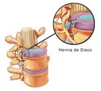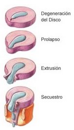 Las fibras anulares del disco, permiten la flexión y la extensión, pero no toleran la rotación excesiva, en cuyo caso se desgarran. Dado que las fibras anulares de la periferia del disco son sensibles, aparece dolor en el momento del desgarro. El traumatismo del disco provoca herniación la cual puede ser hacia el canal medular y producir compresión de raíces nerviosas con su cohorte sintomática dolorosa, sensitiva y refleja, llegando en ocasiones a la parálisis de los segmentos inervados por la correspondiente vía nerviosa.