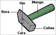 Martillos y mazosEl martillo es una herramienta de mano, diseñada para golpear; básicamente consta de una cabeza pesada y de un mango que sirve para dirigir el movimiento de aquella. La parte superior de la cabeza se llama boca y puede tener formas diferentes. La parte inferior se llama cara y sirve para efectuar el golpe. (Fig. 1)