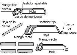 SierrasLas sierras son herramientas manuales diseñadas para cortar superficies de diversos materiales. Se componen de un bastidor o soporte en forma de arco, fijo o ajustable; una hoja, un mango recto o tipo pistola y una tuerca de mariposa para fijarla. (Fig. 12) La hoja de la sierra es una cinta de acero de alta calidad, templado y revenido; tiene un orificio en cada extremo para sujetarla en el pasador del bastidor; además uno de sus bordes está dentado.