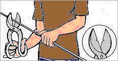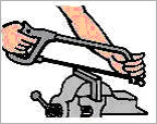 Utilizar la sierra cogiendo el mango con la mano derecha quedando el dedo pulgar en la parte superior del mismo y la mano izquierda el extremo opuesto del arco. El corte se realiza dando a ambas manos un movimiento de vaivén y aplicando presión contra la pieza cuando la sierra es desplazada hacia el frente dejando de presionar cuando se retrocede. (Fig. 14)