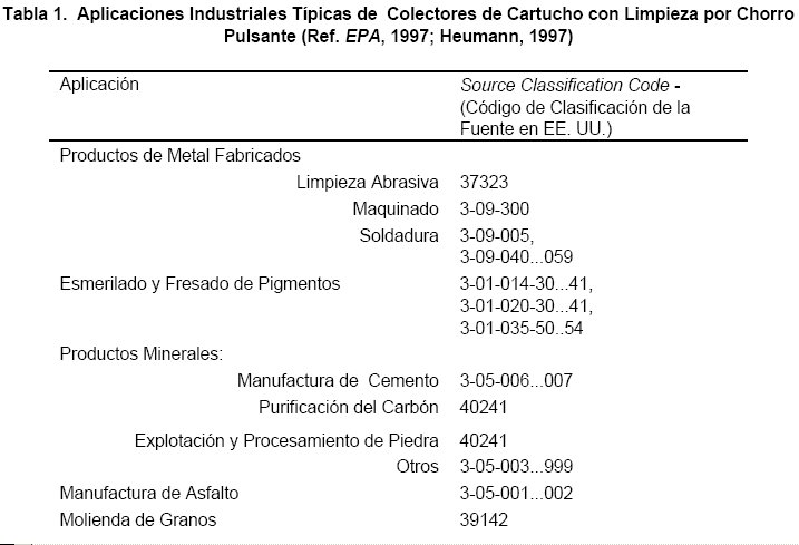 Los colectores de cartucho funcionan muy efectivamente en muchas aplicaciones diferentes. En la Tabla 1 se presentan aplicaciones comunes de sistemas de filtros de cartucho con limpieza por chorro pulsante.