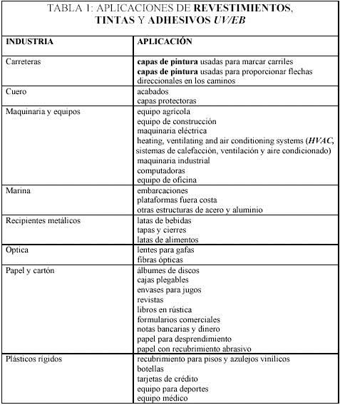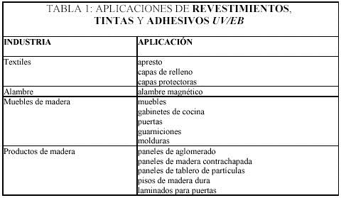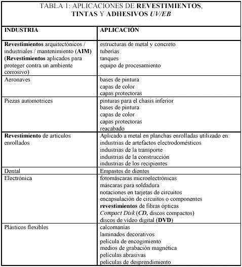 Los revestimientos, tintas y adhesivos UV/EB se utilizan en una variedad de aplicaciones tales como tintas de impresión, barnices de sobreimpresión, revestimientos de desmoldar, imprimadores, pinturas pigmentadas, capas protectoras transparentes, revestimientos de adhesión para cinta magnética, adhesión para abrasivos, encapsulados, adhesivos sensibles a la presión y adhesivos de unión permanente. La lista de aplicaciones sigue creciendo, por lo que no debe considerarse completa a inguna lista estática de aplicaciones. No obstante ello, a fin de apreciar el grado al cual se está aplicando la tecnología UV/EB, se suministra una lista de aplicaciones UV/EB compilado por Envirosense y del RadTech UV/EB-Curing Primer en la Tabla 1. También se pueden encontrar ejemplos de aplicaciones de materiales UV/EB en el Apéndice B. |