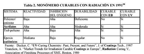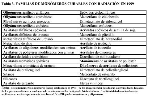 Todos los revestimientos, tintas y adhesivos (es decir, transportados por solvente, transportados por agua o curados con UV/EB), independientemente del método de curado, utilizan básicamente las mismas resinas. No obstante ella, las resinas usadas con los materiales curados con UV/EB han sido modificadas por la inclusión de grupos funcionales y fotoiniciadores que disparan la polimerización. Para los materiales UV/EB, se han obtenido diferentes propiedades de rendimiento al usar acrílicos, metacrilatos, epoxis, poliésteres, polioles, glicoles, siliconas, uretanos, éteres vinílicos, y combinaciones de éstos. Se pueden mezclar entre sí monómeros u oligómeros estructuralmente diferentes para ajustar las propiedades del polímero final. La composición de una formulación por lo general se considera patentada y, por tanto, habitualmente se la conoce mediante un nombre comercial que normalmente no revela su composición. La Tabla 2 muestra monómeros y oligómeros que estaban disponibles en 1991. Se incluyen grupos funcionales de acrílicos o éteres vinílicos en estos monómeros para permitirles ser curados mediante energía radiante UV/EB. La lista de monómeros y oligómeros ha crecido bastante para 1999. Vea la Tabla 3. Este listado es por tipos genéricos. Las formulaciones reales están compuestos de estos tipos de compuestos en una mezcla patentada. La mezcla será identificada por un nombre comercial que no dará pauta alguna con respecto a sus elementos constituyentes.