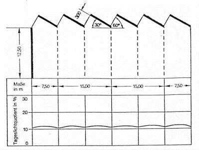 Figura 38 – Niveles del cociente de luz diurna en un hangar con luces cenitales (según Jacob/Scholz).