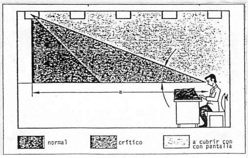 La iluminación que llega desde arriba en un puesto de trabajo debe tener con respecto a la horizontal un ángulo mínimo de 30°. Esta recomendación es válida cuando se debe tener en cuenta el caso más desfavorable del área, que es el puesto de trabajo más alejado de la fuente de iluminación, si esto no es posible se debe recurrir a alguna pantalla.