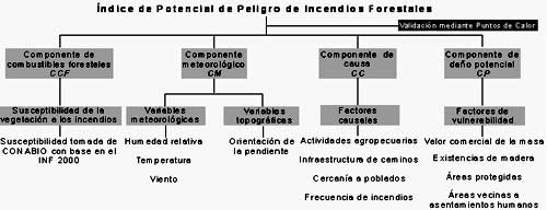 Como resultado de la integración de las variables ambientales que influyen en el peligro de incendios, se han derivado cuatro subíndices o componentes del Potencial de Peligro de Incendios Forestales: