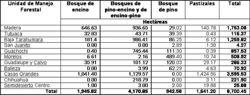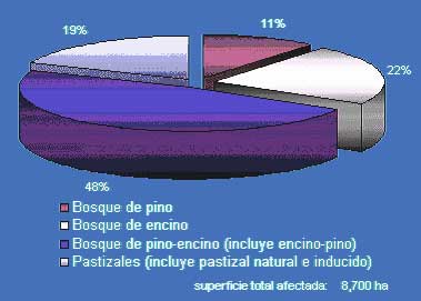 Se estima que durante la temporada de incendios del 2003, se afectó una superficie total de 8,700 hectáreas, de las cuales, el 48 % se presentó en bosques de pino-encino incluyendo los de encino-pino, un 22% en bosques puros de encino, un 11% en bosques puros de pino y finalmente un 19% en pastizales. En la siguiente tabla se registra por unidad de manejo forestal, la distribución de la superficie forestal afectada, mientras que la gráfica siguiente muestra la superficie afectada por tipo de bosque.