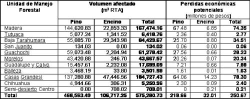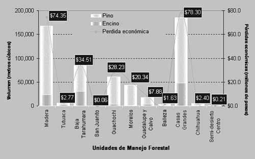 Del volumen total afectado en la unidad de manejo forestal correspondiente a la región de Madera, el 85% corresponde a arbolado de pino y el resto a arbolado de encino, esto produce una perdida en términos económicos de 74 millones de pesos. Por su parte, en la unidad de manejo forestal de la región de Casas Grandes, esta cifra alcanza los 78 millones de pesos; mientras que la unidad de manejo forestal localizada en la Baja Tarahumara, contribuye con un 13% de las pérdidas totales durante la temporada.