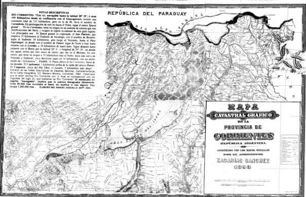 MAPA CATASTRAL DE LA PROVINCIA DE CORRIENTES, EDITADO EN EL AÑO 1893, POR EL AGRIMENSOR DON ZACARÍAS SÁNCHEZ. MUESTRA COMO EL ESTERO Y LAGUNAS DEL SISTEMA IBERÁ, SÓLO OCUPABAN UNAS 90 MIL HECTÁREAS. (TERRENO FISCAL) EL RESTO TENÍA DUEÑOS. ESTABA OCUPADO POR ESTANCIAS, CON ALAMBRADOS, CASAS, HABITANTES, Y SEGÚN ESTADÍSTICAS DE LA ÉPOCA, CASI 1.000.000 DE CABEZAS DE GANADO BOVINO. El MAPA MUESTRA UN RÍO CORRIENTES NAVEGABLE, POR MEDIO DEL CUAL DESAGUABAN EL MILLÓN DOSCIENTAS MIL HECTÁREAS HOY INUNDADAS.