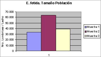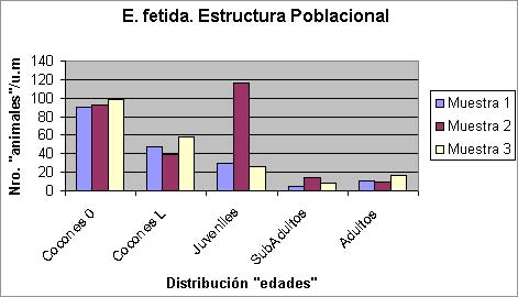 El desarrollo de la población de lombrices desde la inseminación del sustrato hasta el momento del muestreo pareciera hallarse por debajo de los valores esperados, ya que con siembras de 4.000 lombrices / Lecho puede arribarse tras 120 días de vermicompostaje a poblaciones con mas de 100.000 lombrices / lecho (Schuldt, 2004). Con la siembra de 1.400 lombrices / L se necesitaron 100 días mas para adquirir un tamaño poblacional que no sobrepaso el 50% del apiñamiento que se estima tolera el sustrato (experiencias inéditas), una inferencia ratificada por la estructura de la población (alta producción de cocones y relativamente baja representatividad de animales subadultos y adultos)(figura 4), indicando que en pocas semanas (¿4 ó 5?), con las temperaturas de febrero y marzo, se podría expandir la población hasta la capacidad de porte del sustrato utilizado.