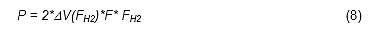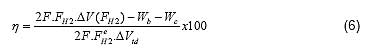 donde F es la constante de Faraday (96485 coulomb/mol); FH2 el flujo molar real de hidrógeno que llega a la celda PEM; FH2 e el flujo molar estequiométrico de hidrógeno que llega a la celda PEM; ΔV(FH2) la tensión real entre bornes de la pila; ΔVtd el potencial termodinámico de la pila PEM; Wc y Wd son los trabajos que consumen la bomba y el compresor respectivamente.
