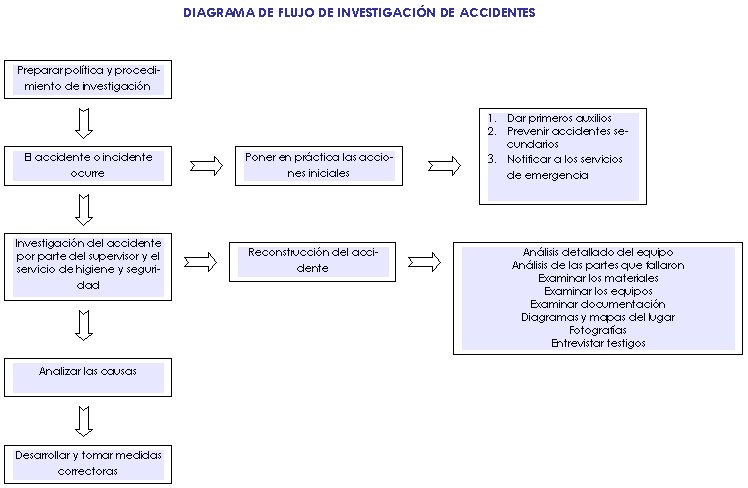 Los procedimientos de investigación de accidentes pueden ser muy complejos y pueden incluir muchas de las fases y paso que se muestran en el cuadro siguiente: