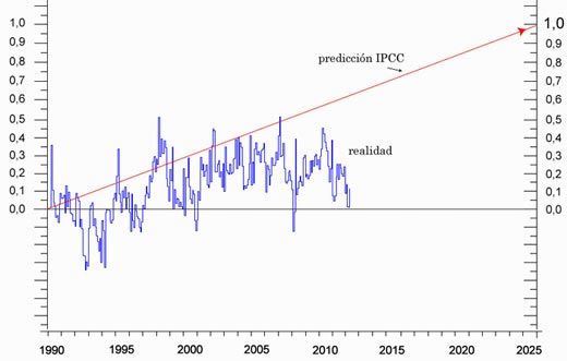 En la gráfica de abajo comparo la evolución de las tem-peraturas mensuales globales, en grados centígrados, desde Enero de 1990 hasta Marzo del 2012, (valor 0 al inicio), con la pendiente pronosticada por el IPCC (unos 0,3ºC por década, 1ºC de subida en el 2025)