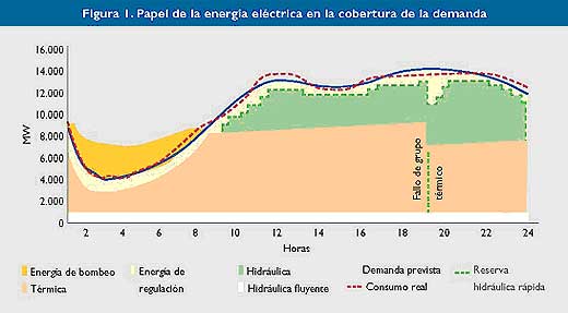 Desde el punto de vista del sistema eléctrico, los aprovechamientos hidroeléctricos, sobre todo aquellos dotados de un embalse asociado, proporcionan una elevada calidad y garantía al suministro de energía eléctrica, facilitando el seguimiento de la cur va de carga, esto es, de las variaciones de la demanda, la regulación de la frecuencia y de la tensión y contribuyendo en caso necesario a la rápida reposición del servicio o a la sustitución inmediata de la producción de centrales térmicas convencionales o nucleares en caso de indisponibilidad fortuita (reserva rodante). De cara al futuro, además de las funciones mencionadas, la energía hidroeléctrica probablemente tenga un papel adicional de compensación de las variaciones de otros medios de producción no despachables, como puede ser la energía eólica (ver Figura 1).