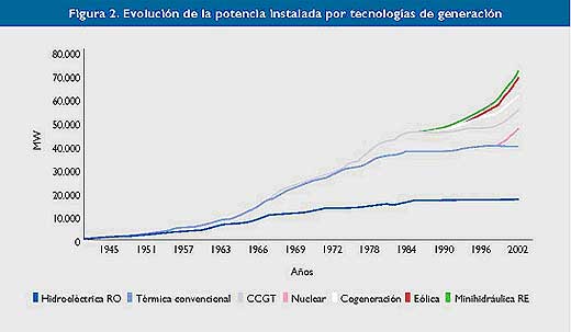 Asimismo, la constitución de una serie de empresas eléctricas de carácter público a finales de los años cuarenta (Empresa Nacional Hidroeléctrica del Ribagorzana, ENHER) vino a sumarse al esfuerzo que hasta entonces había sido realizado por empresas eléctricas privadas, lo cual dio un fuerte impulso al desarrollo hidroeléctrico, que continuó su marcha a buen ritmo en los años siguientes. En efecto, la potencia hidroeléctrica instalada en España ha pasado de los 1.350 MW de 1940 a los 18.400 MW que estaban en servicio a principios del año 2005.