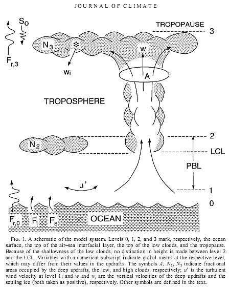 Yo propongo que dos mecanismo interrelacionados, pero separados, actúan directamente para regular la temperatura de la Tierra –las nubes tropicales cúmulos y los cumulonimbus. Los cúmulos son esa nubes como copos de algodón que abundan cerca de la superficie en las tardes cálidas. Cumulonimbus son las nubes de tormenta que comienzan su vida como simples cúmulos. Ambos tipos de nubes son parte del control del acelerador, reduciendo el ingreso de la energía. Además, los cumulonimbus son activos motores de calor que proveen del exceso sobrante necesario para actuar como un gobernador del sistema.