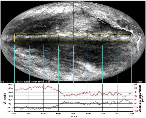 Figura 2: Promedio de un año de las imágenes del satélite GOES-West tomadas al mediodía local del satélite. La Zona de Convergencia Intertropical (ITZC) es la banda brillante en el rectángulo amarillo. El tiempo local en la Tierra se ve en las líneas negras de la imagen. Los valores del tiempo se muestran al pie del gráfico incluido. La línea roja del gráfico es la anomalía del forzamiento solar (en watts/m2) en el área delimitada por el color amarillo. La línea negra es el valor del albedo en el área mostrada en amarillo. |