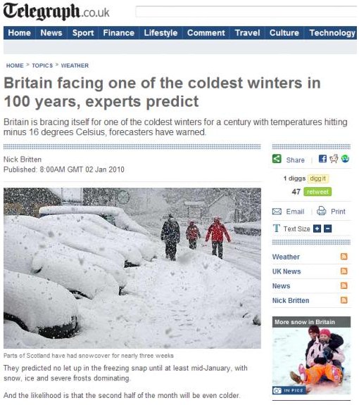 Extractos:“El tiempo frío viene a pesar del pronóstico de largo alcance de la MET Office [el Servicio Meteo-rológico de Gran Bretaña], publicado en Octubre, de un verano templado. Esa predicción siguió a la fallida predicción de un “verano al asador”, que vio fuertes lluvias y el mes de Julio más mojado de los últimos 100 años.