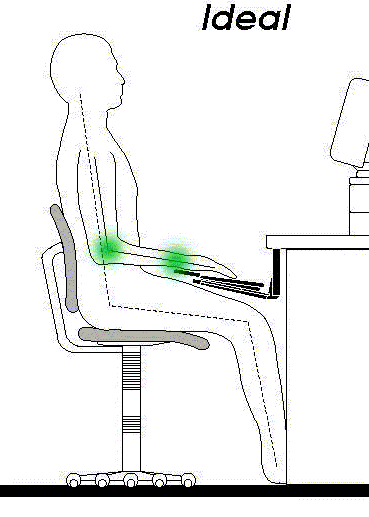 También se logra una posición levemente reclinada, con lo que la región lumbar (espalda baja) se descansa, apoyada contra el respaldo de la silla; el ángulo del codo, el ángulo del abdomen y el águlo poplíteo (bajo las rodillas) se abren un poco, con lo que se facilita la circulación sanguínea hacia el antebrazo, la muñeca y la mano, y extremidades inferiores.