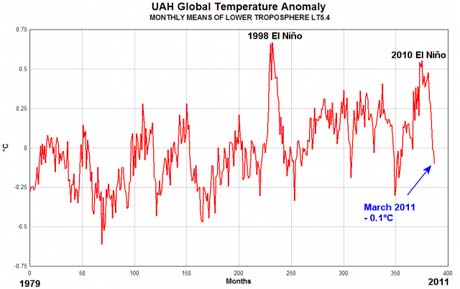 El promedio de la anomalía de la temperatura global de la troposfera baja para Marzo 2011 cayó a -0,10ºC, con enfriamiento en los extratrópicos de ambos hemisferios, mientras que los trópicos permanecieron lo mismo que el mes pasado.