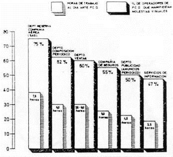 Figura 33 – Horas de trabajo al día en P.C.D. y porcentaje de trabajadores que se quejan de dificultades visuales entre varios grupos de trabajadores de terminales. (Resultados establecidos en Suecia 1976-1981, del informe de la UGT).