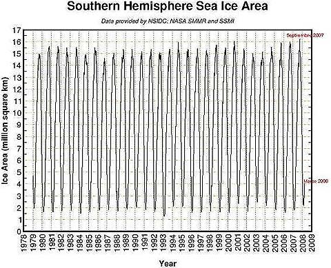 En cuanto a la barrera de hielo Larsen-B, ya sabemos que su colapso (no derretimiento!) lo hizo por causa de su gran crecimiento. El exceso de peso rompió su anclaje con tierra firme y toda la barrera, que era como un balcón suspendido de sus extremos en tierra firme, cayó al mar de un solo golpe. Los científicos afirman que en el pasado, la barrera Larsen ha sufrido periódicamente esta clase de colapso. La absurda publicidad que los medios le han dado al desprendimiento del témpano de hielo de la Bahía Wilkins, atribuyéndolo al calentamiento global, ha indignado a los científicos serios y honestos. Nos hace preguntar ¿cuáles son las bases científicas para que los medios hayan hecho tales declaraciones alarmistas? Todo sale de la afiebrada imaginación de James Hansen y sus alegres modeladores del calentamiento. Existe una comprensión equivocada generalizada acerca de que una leve subida de temperatura puede hacer que el hielo se derrita o hacer que el agua se evapore en grandes cantidades. No es la temperatura quien lo hace. Hacen falta muchos “Julios” (o energía) para lograrlo ¿De dónde provienen esos julios? ¿De un aumento de la radiación de retorno de la atmósfera hacia la superficie, como dicen los calentadores? Eso parece ser una violación de las leyes de la termodinámica. El CO2 por sí mismo no puede generar los julios adicionales que no han sido provistos por el Sol. En realidad, este desprendimiento debe verse dentro del contexto que corresponde: la Bahía Wilkins está en la costa oeste de la Península Antártica. Es el único 2% del territorio que ha sufrido un calentamiento a causa de una alteración en los patrones de vientos y de las corrientes marinas –algo que no tiene ninguna relación ni con el CO2 ni con un presunto calentamiento. El 98% restante de la Antártida está experimentando un enfriamiento continuo desde hace más de 35 años, y precisamente durante el pasado invierno de 2007 se registró la máxima extensión de los hielos marinos que rodean al continente blanco, tal como se puede apreciar en el gráfico provisto por la mismísima NASA. Se ve que la extensión fue la más grande de todos los tiempos monitoreados por los satélites; que la disminución del hielo fue la menor en los últimos cuatro años, y que el hielo comenzó a recuperarse antes de la terminación del verano, indicando condiciones de frío anormales.
