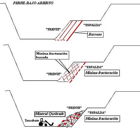 El uso de explosivos en minería busca fragmentar al máximo la roca entre la “Espalda” y el “Frente” de cantera, pero dejando la espalda intacta (Mínima fracturación) para las próximos operaciones de perforación y voladura. El motivo es que si la “espalda” quedara muy fracturada, no sólo es difícil perforar nuevos barrenos (se traban las herramientas), sino que los gases del explosivo se escapan por las fisuras (“Tiro soplado”), perdiéndose gran parte de su poder de fragmentación y por lo tanto desperdiciando energía. De modo que es falso que “en el rajo toda la roca se fractura” (sea Frente o Espalda). Como podemos ver en cualquier talud o corte de una ruta de montaña por ejemplo, la “espalda” debe quedar lo mas entera posible, justamente para evitar futuros desmoronamientos. Lo cierto es que al Frente se lo trata de fracturar al máximo, pero a la Espalda se la trata de preservar lo mas entera posible.