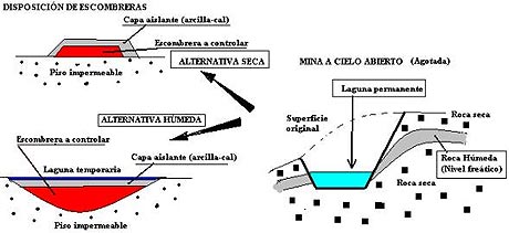 Para la disposición final de las escombreras y su control post-minado, se busca un piso impermeable en las cercanías o se lo prepara a propósito. Si el relieve del sitio elegido es negativo (hondonada) siempre habrá alguna acumulación temporaria anual de agua (lagunas o charcos someros) por lo cual se usa la Alternativa húmeda.