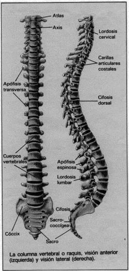 Las curvas sagitales son de arriba hacia abajo; cervical, (convexa hacia delante); dorsal, (cóncava hacia delante); lumbar (convexa hacia delante) y por último sacro-coccígea, (cóncava hacia adelante).