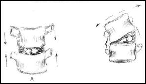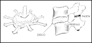 Figura 54.  (A) disco con presión interdiscal en el núcleo separa las vértebras, esta presión está contrarrestada por el anillo y los ligamentos longitudinales.