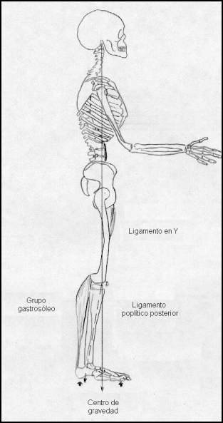 Para mantener una postura erguida en posición de pie, el hombre necesita apoyarse como se observa en la figura 57. sobre su ligamento longitudinal anterior y con las rodillas enganchadas en extensión y apoyando sus ligamentos anteriores de la cadera es decir el ligamento en “Y”, teniendo que sólo el tobillo no puede ser inmovilizado por los ligamentos, el gastroctunus mantendrá el equilibrio de la pierna, que posee una inclinación hacia delante de alrededor de los 2° o 3°, el grupo gastrosoleo tira la pierna hacia atrás sobre el pie que está fijo al suelo. Para mantener erecta la columna es necesario realizar un constante esfuerzo muscular, para ello la columna se inclina en su ligamento longitudinal anterior, aumentando sus articulaciones posteriores; esta postura alivia el esfuerzo muscular momentáneo, pero luego se torna molesta por que las facetas posteriores no están preparadas para soportar peso en forma continua.
