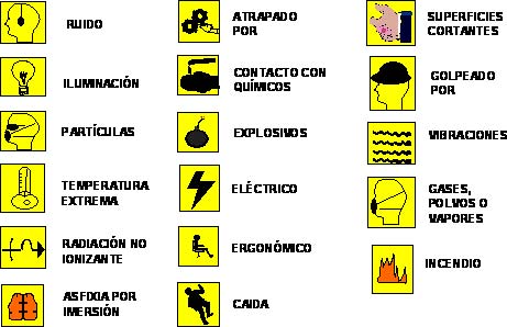 En la definición anterior se menciona el uso de una simbología que permite representar los agentes generadores de riesgos de Higiene Industrial tales como: ruido, iluminación, calor, radiaciones ionizantes y no ionizantes, sustancias químicas y vibración, para lo cual existe diversidad de representación, en la figura 1, se muestra un grupo de estos símbolos, que serán usados para el desarrollo del trabajo practico.
