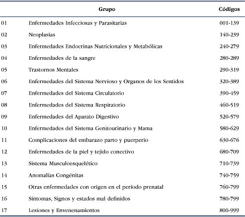 Enfermedad que provoca el proceso, codificada mediante la CIE9 modificada. Este código CIE 9 MC, ha sido aprobado por el Consejo Interterritorial del SNS como sistema de clasificación y codificación de diagnósticos y procedimientos. La lista de enfermedades se divide en 17 capítulos, cada capítulo en secciones y cada sección en categorías de tres dígitos (tabla 1).