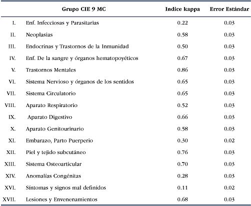 La mayor concordancia se obtuvo para el grupo diagnóstico de trastornos mentales (grupo V de la CIE 9MC) con un kappa de 0,86 (error estándar 0,03), seguido de los grupos XII (piel y tejido subcutáneo), XIII (sistema osteoarticular) y XVII de lesiones y envenenamientos (tabla III).