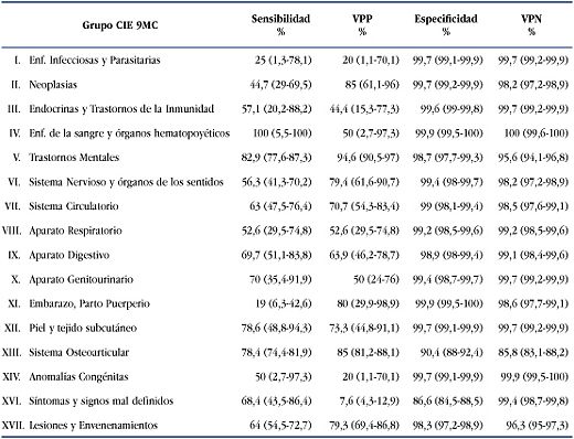 Se valoró la calidad mediante la reproducibilidad, a través del índice kappa, y la validez del diagnóstico por grupos de la CIE-9-MC con los parámetros sensibilidad, especificidad y valores predictivos.