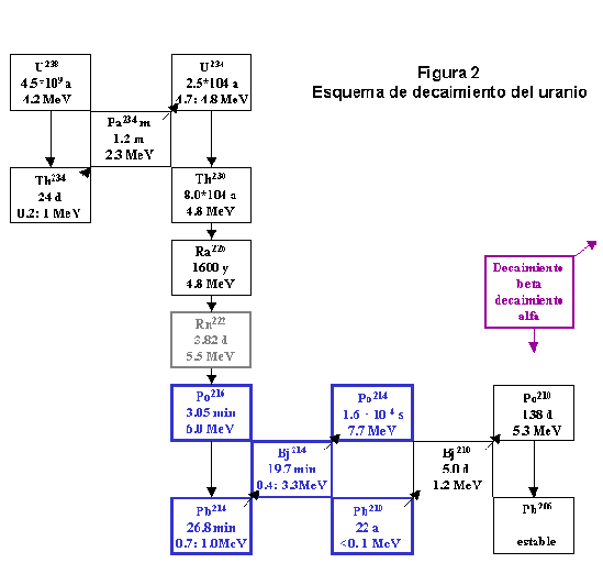 El radón se presenta en dos formas principales: el radón-222, uno de los radionucleidos presentes en el proceso de desintegración del uranio-238 (Figura 2)., y el radón 220 producido en las series de desintegración del torio-232. El radón-222 es unas 20 veces más importante, desde el punto de vista radiológico, que el radón-220.