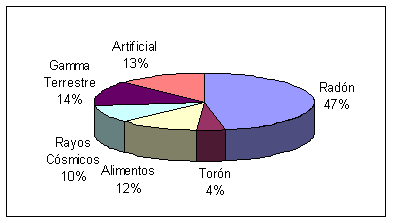 En los últimos años se ha determinado que la fuente de radiación de origen natural que más contribuye a la dosis efectiva recibida por el ser humano es un gas (incoloro, insípido e inodoro) denominado radón. Se ha estimado que el radón y los radionucleidos resultantes de su desintegración -conocidos como progenie del radón- contribuyen aproximadamente con la mitad de la dosis efectiva recibida de la totalidad de las fuentes naturales. La mayor parte de la dosis debida al radón proviene de su progenie. (Figura1).