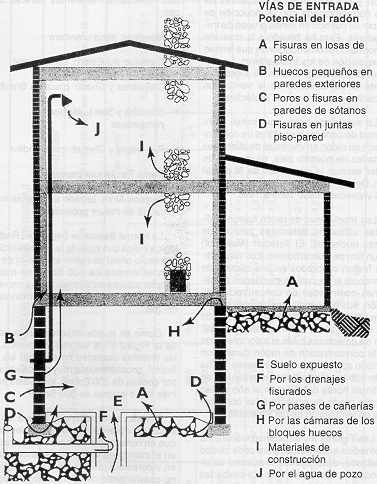 Dado que el uranio se encuentra en todos los suelos y que el radón se origina por el decaimiento radiactivo natural de ese elemento, el radón, como gas radiactivo, también se encuentra en todos lados. Normalmente se mueve a través de la corteza terrestre hacia la atmósfera y penetra en una casa a través de poros o fisuras en pisos y paredes y por los espacios mal sellados alrededor de cañerías. También puede ser liberado directamente por los propios materiales de construcción de la vivienda, por las aguas subterráneas con origen en pozos profundos,  por puertas y ventanas, etc. (Fig. 3)