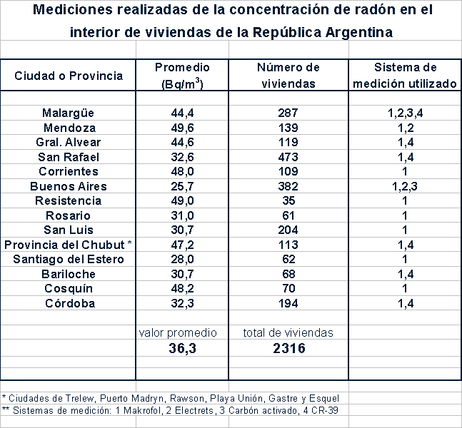 Como se puede observar, los promedios de las concentraciones de gas radón en distintas ciudades de la Argentina varían entre 25,7 Bq/m3 y 49,6 Bq/m3 con un promedio en todo el país de 36,3 Bq/m3. El mayor porcentaje de viviendas medido (71%) se encuentra en el rango de concentraciones de radón más bajo, de 0 a 40 Bq/m3, son muy pocos los valores por encima de 200 Bq/m3 .(Tabla 1).