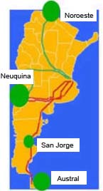 En la República Argentina, la producción del gas natural está muy asociada a la del petróleo. En la figura adjunta, se observan las distintas cuencas existentes en nuestro país.