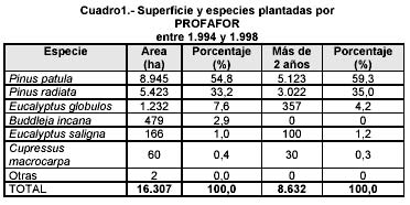 Para este trabajo se consideraron las plantaciones establecidas por PROFAFOR a partir de 1.994 hasta finales de 1.999. Hasta esa fecha se tenían suscritos 121 contratos de forestación que cubrían un área de 16.307 ha en la sierra ecuatoriana. En el Cuadro 1 se puede observar la distribución del área por especies, siendo la de mayor porción la especie Pinus patula con 54,8 % del área total seguido por el P. radiata con 33,2 %. El remanente 12 % los compone principalmente Eucalyptus globulos, E. saligna, Cupressus macrocarpa y Buddleja incana.