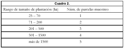 Como segundo criterio para la selección de plantaciones, se decidió hacer un muestreo solamente aquellas con superficie superior a 25 ha. Para proceder a definir el número de parcelas por plantación, se tuvo en cuenta los rangos indicados en Cuadro 2.: