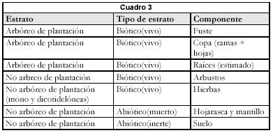 La toma de las mediciones en cada parcela se dividió en los siguientes estratos y componentes (Cuadro 3)