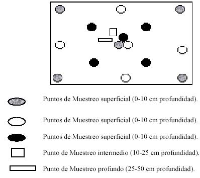 En cada parcela se levantó un perfil del suelo, describiendo cada uno de sus horizontes (profundidad, textura, color, estructura, drenaje). La profundidad del horizonte orgánico A fue estimada con base en los cambios de coloración de los suelos. Se recolectaron cinco muestras de suelo así: de 0 a 10 cm de profundidad tres muestras, de 10 a 25 cm una muestra y de 25 a 50 cm una muestra. Se tomaron muestras de 500 g de suelo y se llevaron al Laboratorio del SESA. Allí se realizaron análisis químico de materia orgánica, nitrógeno, potasio, fósforo y pH, y físico de contenido de humedad y densidad. El contenido de carbono fue determinado en el Laboratorio por el método de Walkley-Black. La toma de las muestras de suelo para laboratorio fue producto de un muestreo más intenso como se indica en el siguiente esquema: