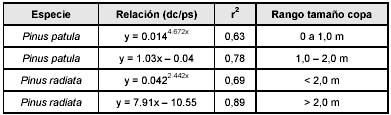 Se midió la altura total y proyección de diámetro máximo de copa con vara y cinta métrica graduada (0,1 cm) respectivamente. Se pesó el total de la copa con balanza graduada (0,1 kg), procediendo a segmentar las ramas gruesas. Se tomó una muestra de ramas y de acículas de aproximadamente 1,0 kg cada una en bolsas plásticas, se pesaron con balanza graduada (0,1 kg) y se llevaron al laboratorio para determinar peso seco. Para ello se secaron al horno a 104 °C ras hasta obtener peso seco y determinar relación peso húmedo/peso seco.