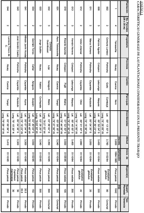 Se tomó información general sobre la plantación, como es localización geográfica y política-administrativa, altitud, superficie, especies, edad, nombre del propietario, la cual aparece en el Anexo 1. Se diseñaron formularios de campo para las características generales de la parcela y para la descripción general del sotobosque basada en su fisonomía, altura, grado de cobertura y géneros dominantes. Para lo anterior se tuvo en cuenta otras investigaciones realizadas por Copas, Groenendijk & Hofstede (1.997) en plantaciones de pinos, Fehse et al. (1.999) para determinar biomasa y carbono de bosques naturales en zona alta del Ecuador y Tonneijck (1.998) en páramos herbáceos, todos citados por Hofstede y Aguirre 1.999. Todos estos trabajos fueron ejecutados dentro de las actividades del Proyecto de Investigaciones en Páramos y Bosques Andinos (ECOPAR). Para la determinación de carbono se basó en la metodología en Nabuurs & Mohren (1.995) y de Fehse et al. (1.999).