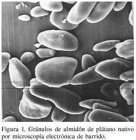 La composición química proximal del almidón de plátano es (%): almidón 98,0 ±2,00; proteínas 0,22 ±0,01; cenizas 0,47 ±0,02; y grasa 0,26 ±0,01. El almidón de plátano nativo presenta una naturaleza no iónica y sus gránulos (Figura 1) son de formas irregulares, esferoides y alongadas, con diámetro de 12,8-40m y longitud de 16,6-51,7m.