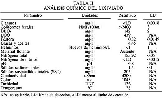 La muestra de lixiviado se tomó en el mes de septiembre de 2006 (precipitación mensual de 534mm), en una región con precipitación anual de 3424mm. La temperatura ambiente al momento de la toma de muestra fue de 26°C. En la Tabla II, se muestran los análisis de la composición del lixiviado realizada por la Entidad Mexicana de Acreditación (EMA). De acuerdo a los mismos, se tiene que plantear la posibilidad de una fuerte dilución ocasionada por las lluvias intensas durante el periodo de muestreo, ya que algunos parámetros conservativos como SST y fósforo, muestran valores menores a los reportados (Tchobanoglous et al., 1998).